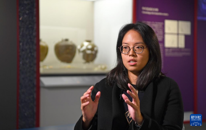 香港文物探知馆一级助理馆长李晓慧在讲解“从湾区启航:‘南海一号’与海上丝绸之路”展览上展出的南海窑酱釉“淳熙十年”印文四系罐(2024年11月28日摄)。新华社记者 陈铎摄